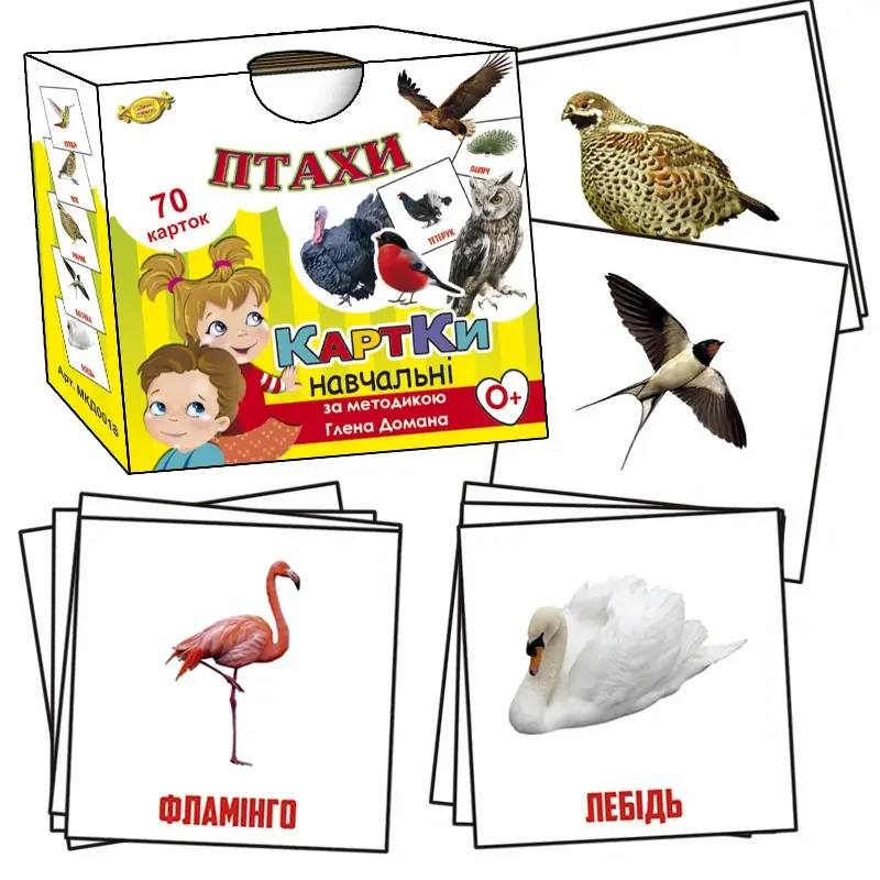В комплект "ПТИЦЫ" входят 70 карточек с изображением птиц: курица, гусь, утка, попугай, ворона, воробей, сова, дятел, орёл, ласточка, аист, сорока, индюк, голубь, кукушка, соловей, скворец, канарейка, страус, перепел, павлин, лебедь, чайка, цапля, глухарь, фламинго, беркут, пеликан, баклан, грач, дрозд, жаворонок, зяблик, синица, стриж, тетерев, сыч, чиж, чибис, ястреб, дрофа, альбатрос, галка, гриф, журавль, иволга, ибис, поручейник, кондор, клёст, колибри, пыжик, рябчик, снегирь, сапсан, фазан, фрегат, гагара, балабан, кречет, пересмешник, зимородок, пеночка, кедровка, бекас, ворон, щегол, филин, лунь, гарпия.