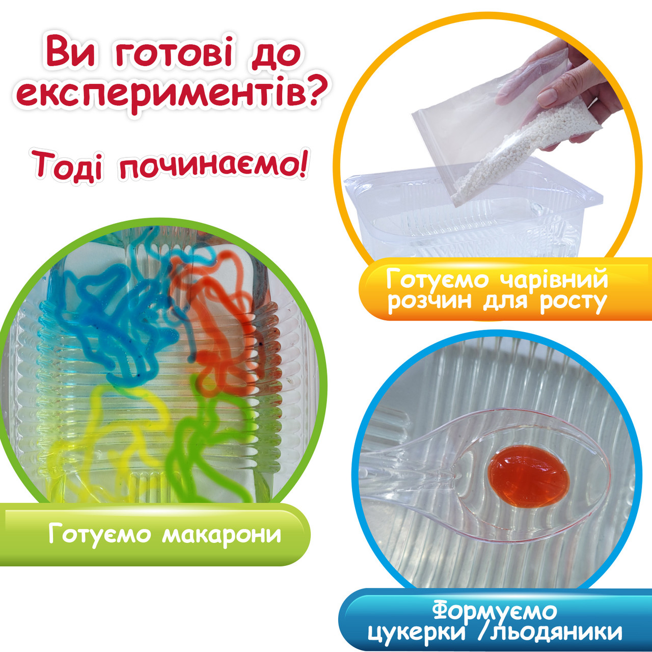 Набір містить спеціальні гелі, які мають здатність перетворюватися у макарони чи кульки-льодяники, різних істот і тваринок. Головне – фантазія і спеціально приготований, чарівний розчин для росту.