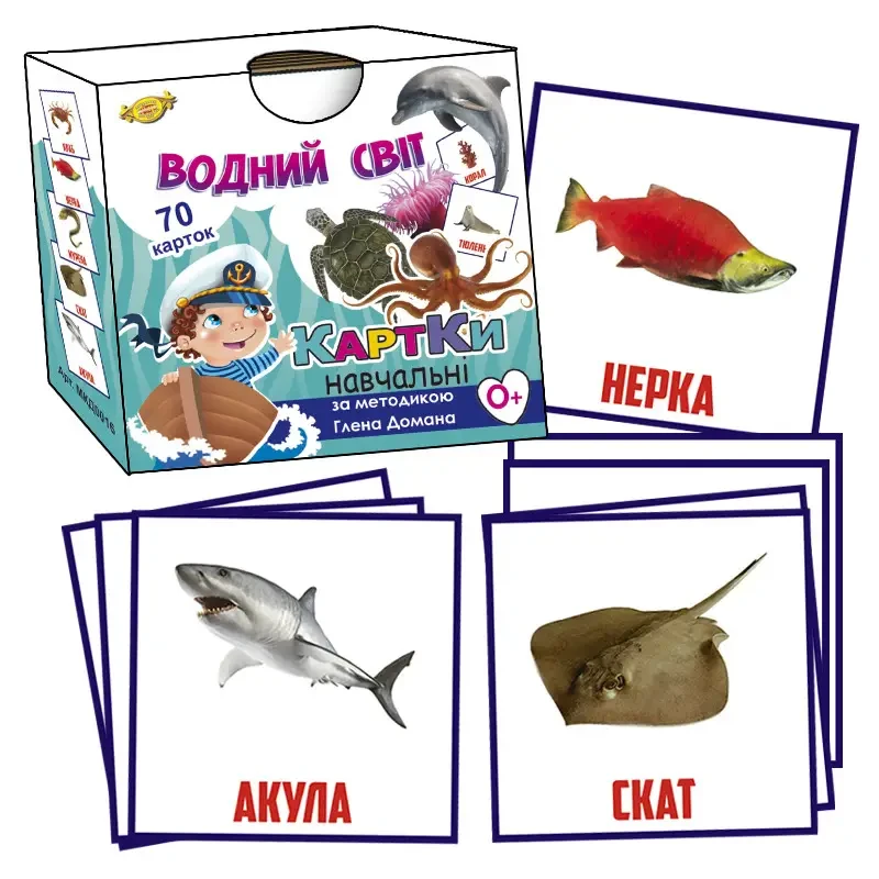 В комплект "ВОДНЫЙ МИР" входят 70 карточек с изображением обитателей рек, морей, океанов: акула, кит, черепаха, краб, рак, дельфин, щука, окунь, карась, камбала, сом, сельдь, осетр, медуза, осьминог, омар, кальмар, скат, креветка, тюлень, судак, ёрш, плотва, лещ, карп, налим, стерлядь, лосось, форель, пиранья, угорь, пескарь, вьюн, скумбрия, треска, тунец, палтус, горбуша, кефаль, хамса, бычок, мойва, красноперка, язь, фугу, сазан, гуппи, мурена, барракуда, сардина, ставрида, салака, килька, линь, пангасиус, коралл, нарвал, мидия, наутилус, устрица, актиния, каракатица, ламантин, дюгонь, морж, нерка, катран, барабуля, дорадо, сибас.