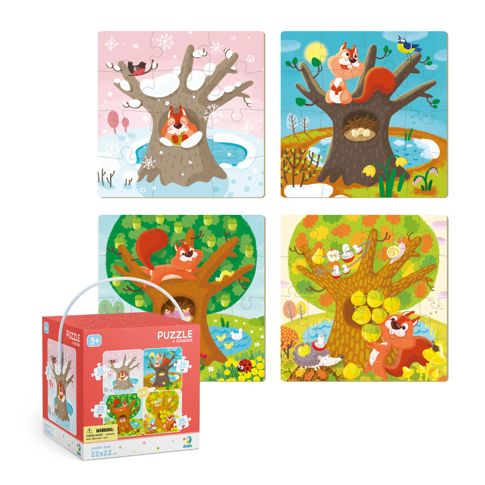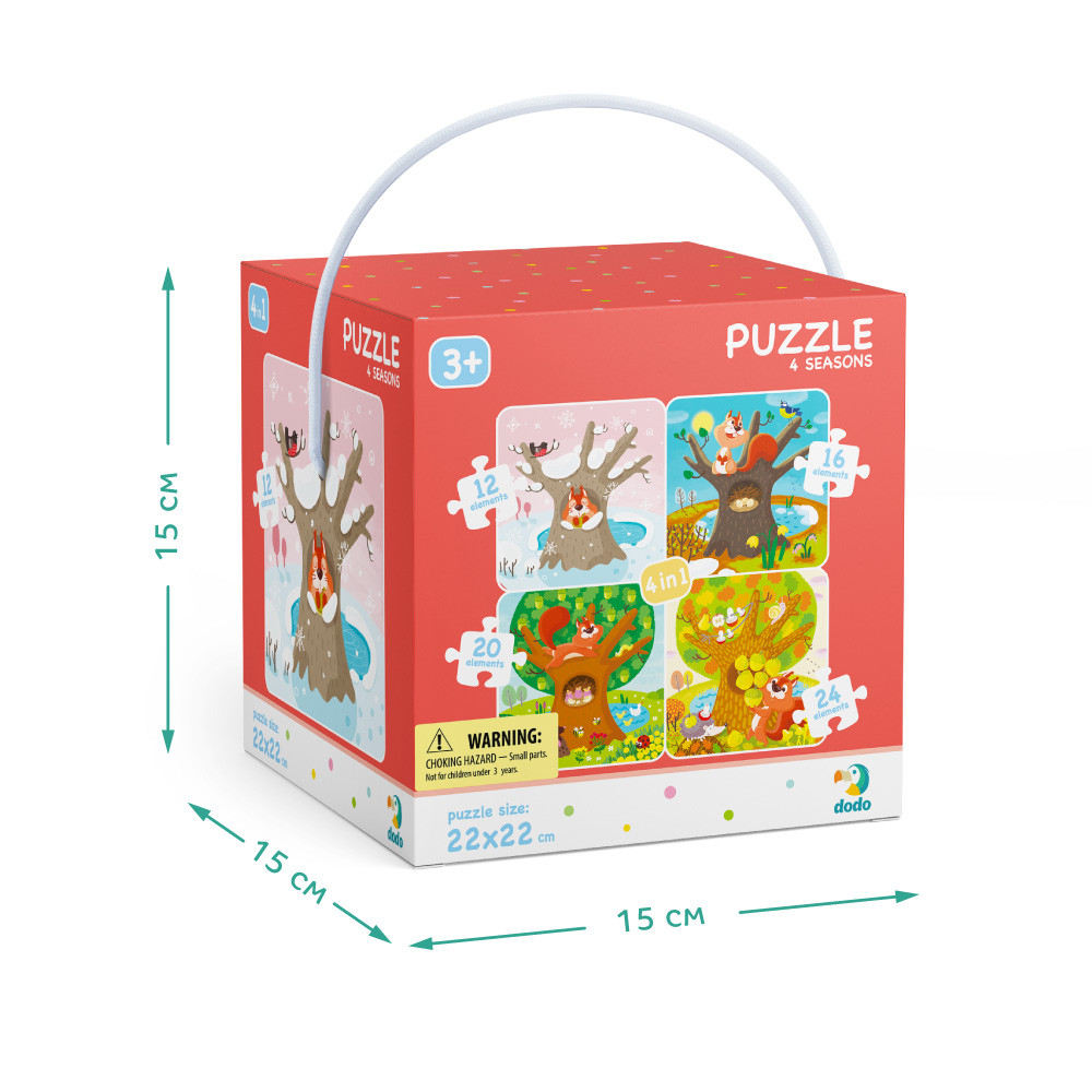 Що може бути краще за один пазл? Звичайно — чотири пазли у одній коробці! «Пори року» зображають чарівні картинки з природою, які допомагають навчати малят зміні сезонів. В одному наборі представлено 4 рівня складності пазла: на 12, 16, 20 та 24 елементи, тож гру можна ускладнювати з часом. Підходить для дітей від 3-х років, допомагає їм розвивати дрібну моторику, координацію та просторове мислення.