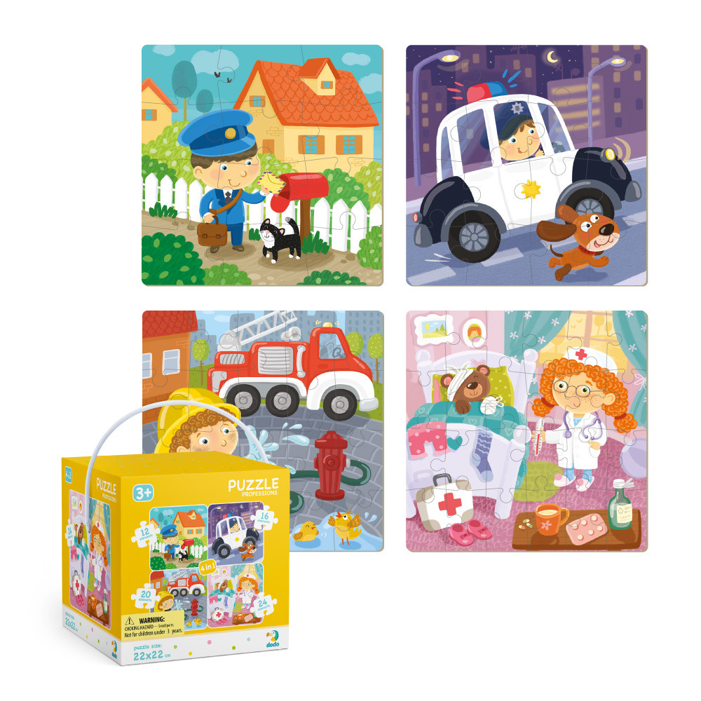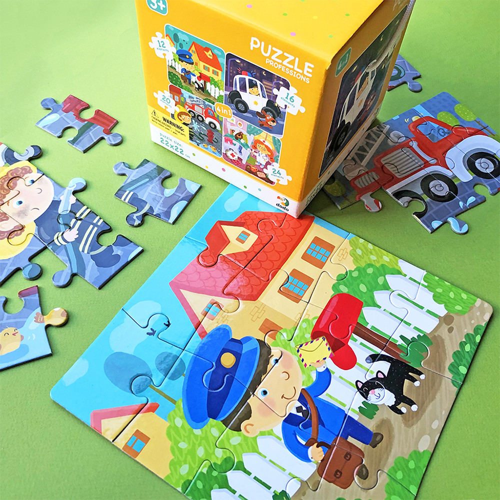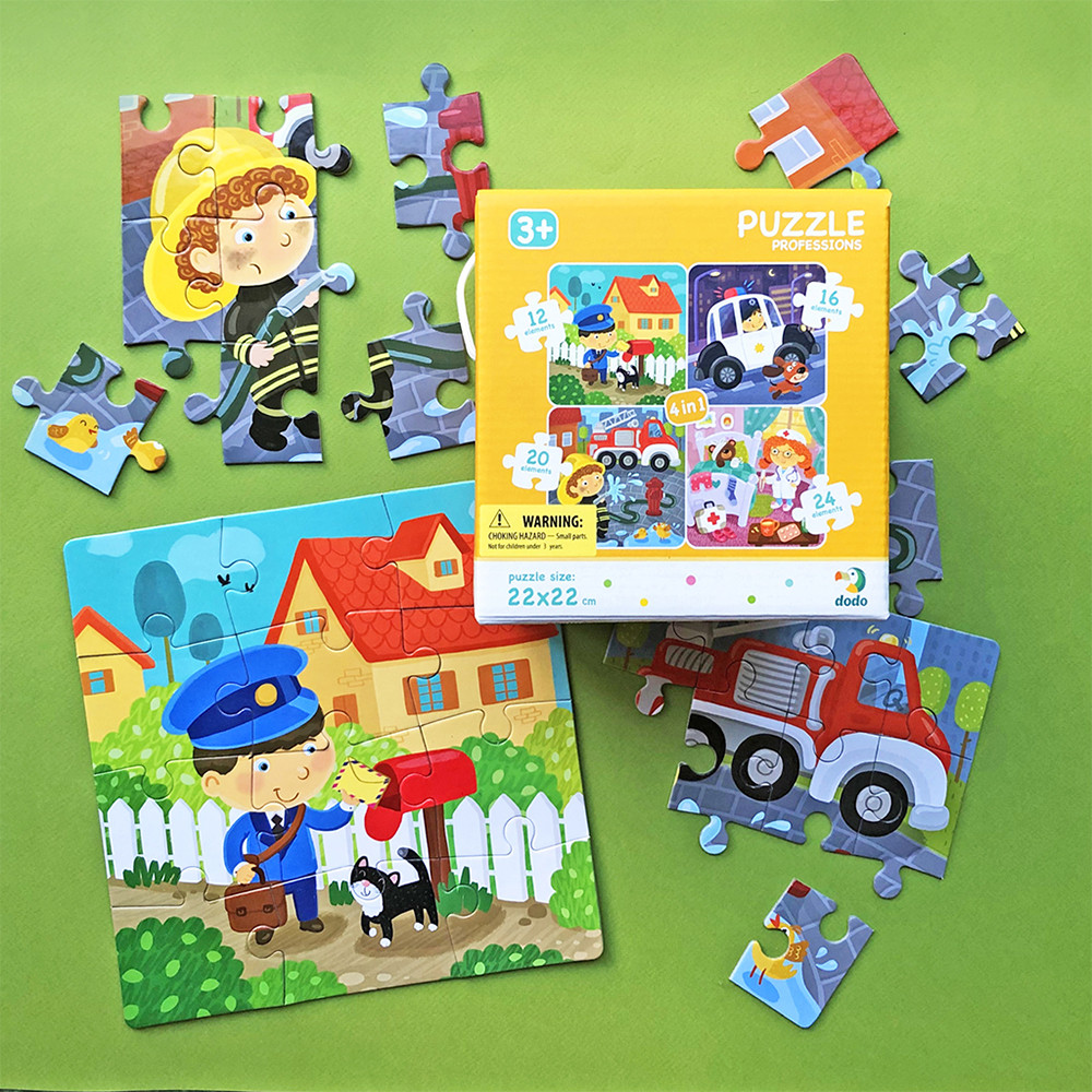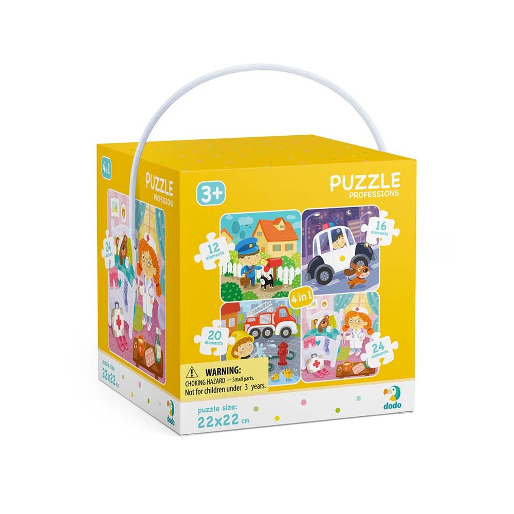 Лікар лікує хворих, поліцейський слідкує за правопорядком, а що роблять листоноша та пожежник? Розкажи мені та покажи на картинці. Вивчаємо професії разом з пазлом 4в1. Бо що може бути кращим за один пазл? Тільки чотири пазли у одній коробці! В одному наборі представлено 4 рівня складності пазла: на 12, 16, 20 та 24 елементи, тож гру можна ускладнювати з часом. Підходить для дітей від 3-х років, допомагає їм розвивати дрібну моторику, координацію та просторове мислення.
